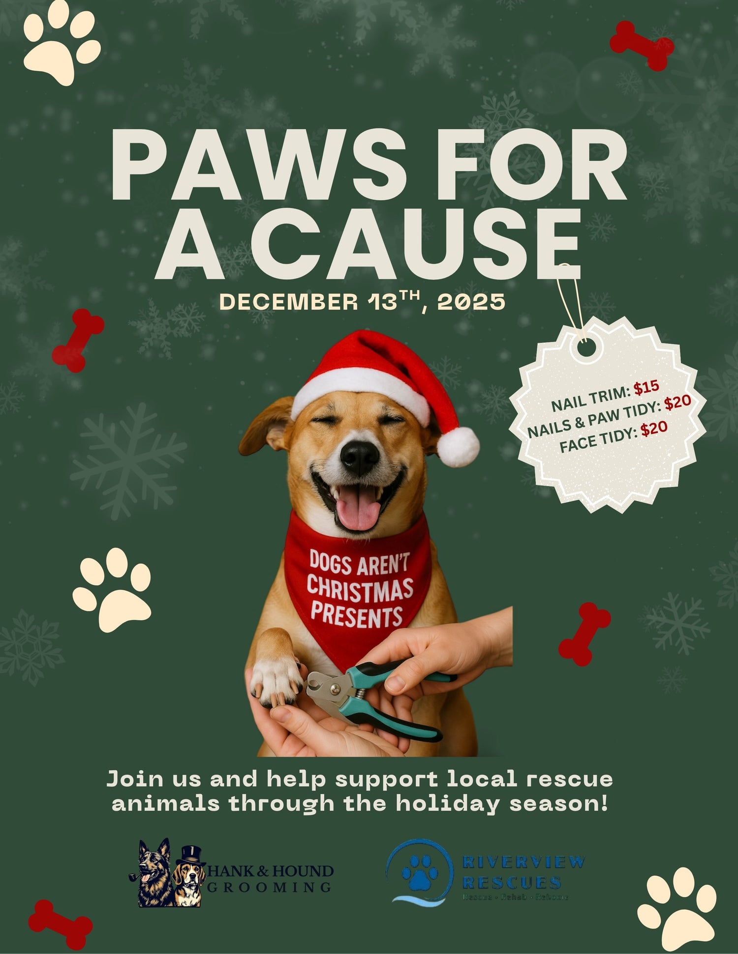 Join us for our Holiday Nail Trim Clinic, where 100% of proceeds will be donated to Riverview Rescues to support animals waiting for their forever homes. ❤️